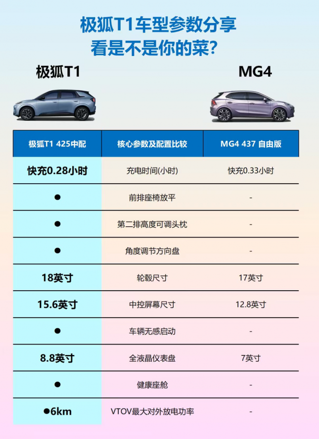 空间方面,极狐T1和MG4都主打实用,但T1在“大空间不牺牲续航”这点上做得很到位。先看尺寸:极狐T1轴距2770mm,比MG4的2750mm长了20mm,后排腿部空间更充裕,1米85的人坐进去也不会觉得局促;虽然极狐T1车长4337mm略短于MG4的4395mm,但它1860mm的车宽、1572mm的车高都比MG4更优,横向空间更宽,后排坐三个人也不会互相碰肘,头部空间也不压抑。后备箱设计更见巧思,两者都是可拓展的三层结构,但极狐T1下方掏空区域更方正,放行李箱、露营装备更方便,还自带照明灯,夜间取物不用摸黑;后排座椅放倒后,极狐T1的后备箱容积能达到1352L,比MG4的1100L多了不少,而且极狐T1前排座椅能完全放平,铺上床垫就是临时床铺,露营时特别实用。关键是,极狐T1空间大却没牺牲续航——它有425km真续航,搭配热泵空调能节能15%,多跑30公里,电机还是高铁同源的八合一电驱,重量轻、功率密度高,能耗控制得好,真正做到了“大空间+长续航”两不误。